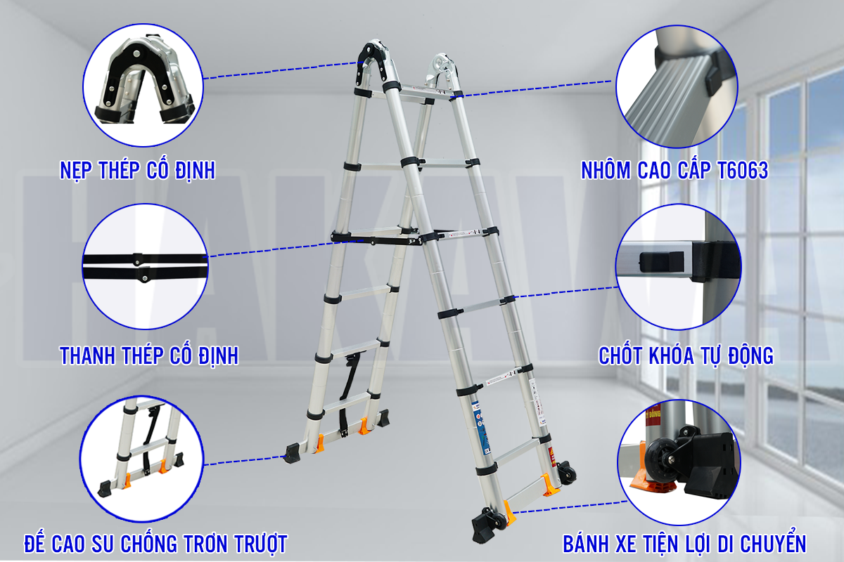 - 👉 Với thiết kế hiện đại, với khả năng có thể rút gọn khi không sử dụng giúp ạn có thể di chuyển thang tới bất kỳ địa hình nào một cách nhẹ nhàng và đặc biệt bạn có thể bảo quản thang ở bất kỳ đâu trong ngôi nhà bạn mà không chiếm quá nhiều diện tích.